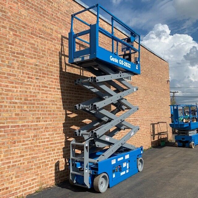 The Genie-2632 slab scissor lifts, with their quiet electric operation, are perfect for construction, maintenance, and installation tasks both indoors and outdoors on solid, level ground.