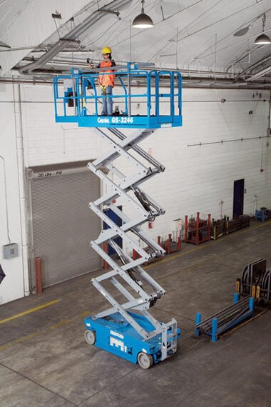 With its compact size and zero inside turning radius, the Genie GS-3246 E-Drive slab scissor lift is perfect for construction and indoors work. It provides superior efficiency and extended runtime, especially when extensive driving is necessary.